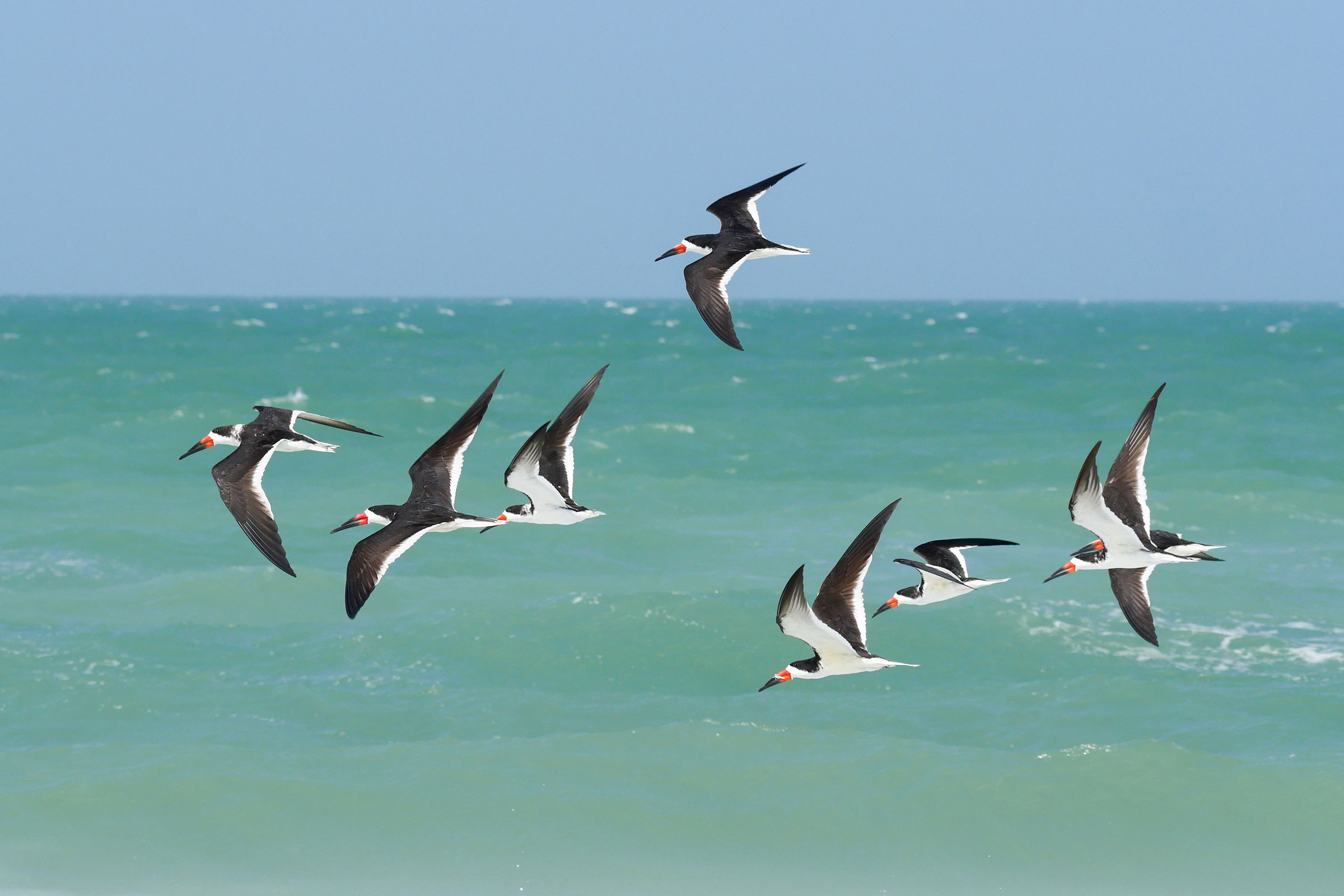 It’s been a while since I’ve published a featured image for the website slider. Doing it now, I was surprised that I hadn’t featured one that is many people’s favorite (and one of mine). A small flock of skimmers flying over the beautiful water at Fort De Soto.