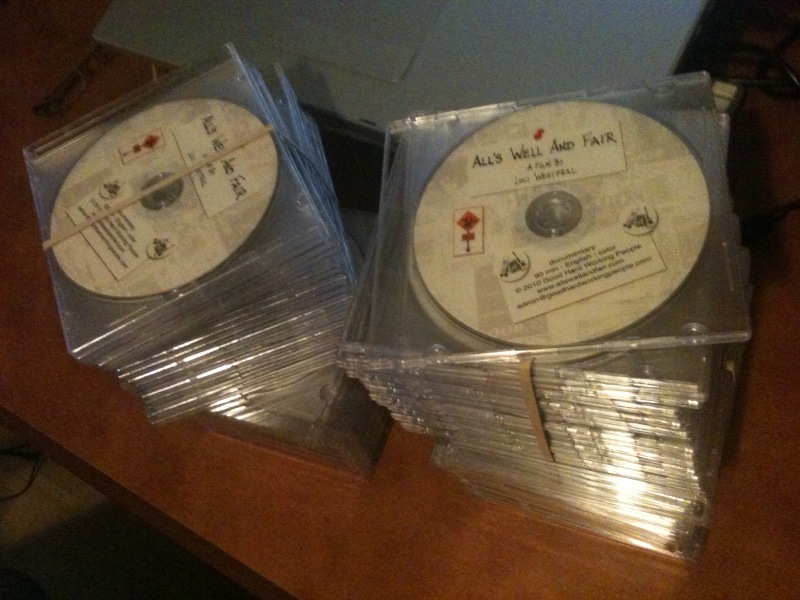 Just like with our All God’s Children screener DVDs, we used RL Labs, who provided a very quick turnaround and delivered a great product (and who do some of their sales through their miniature trains store!). I now have 100 screener DVDs of All’s Well and Fair!