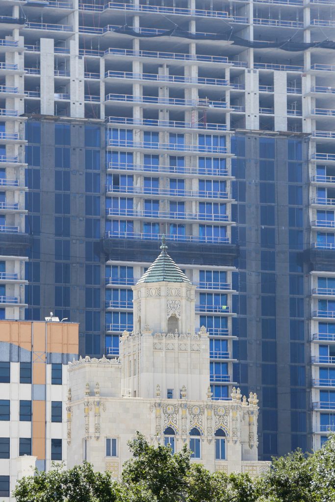 The photography presented on construction-related media (wood, metal, concrete, glass) and on historic St. Pete windows juxtaposes iconic, historic buildings with new high-rise constructions and other new-builds. Images of a construction site transferred to discarded wood from the same site points to sustainability.