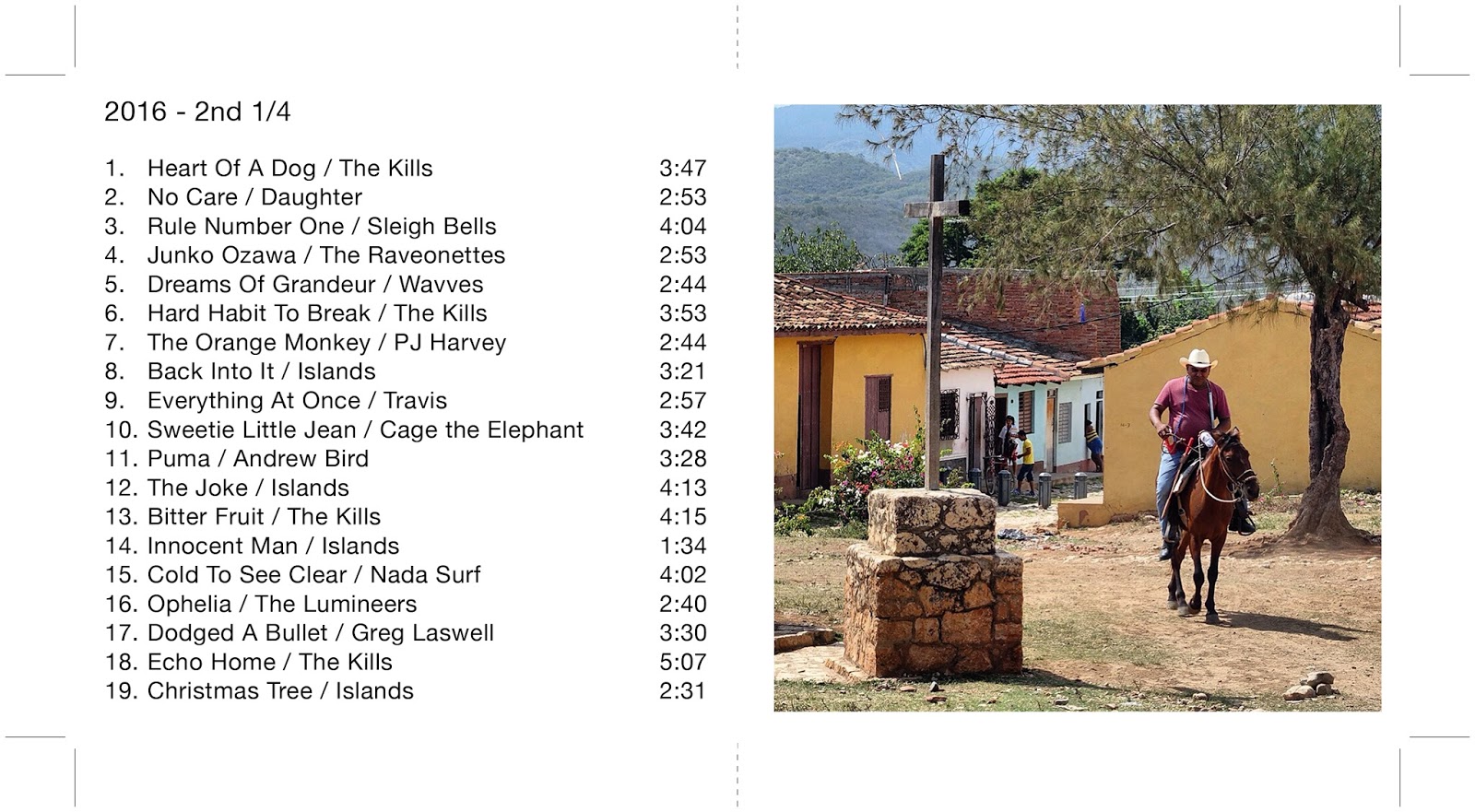 | Cover and song list for the spring 2016 mix, featuring a photo I took in Trinidad, Cuba |