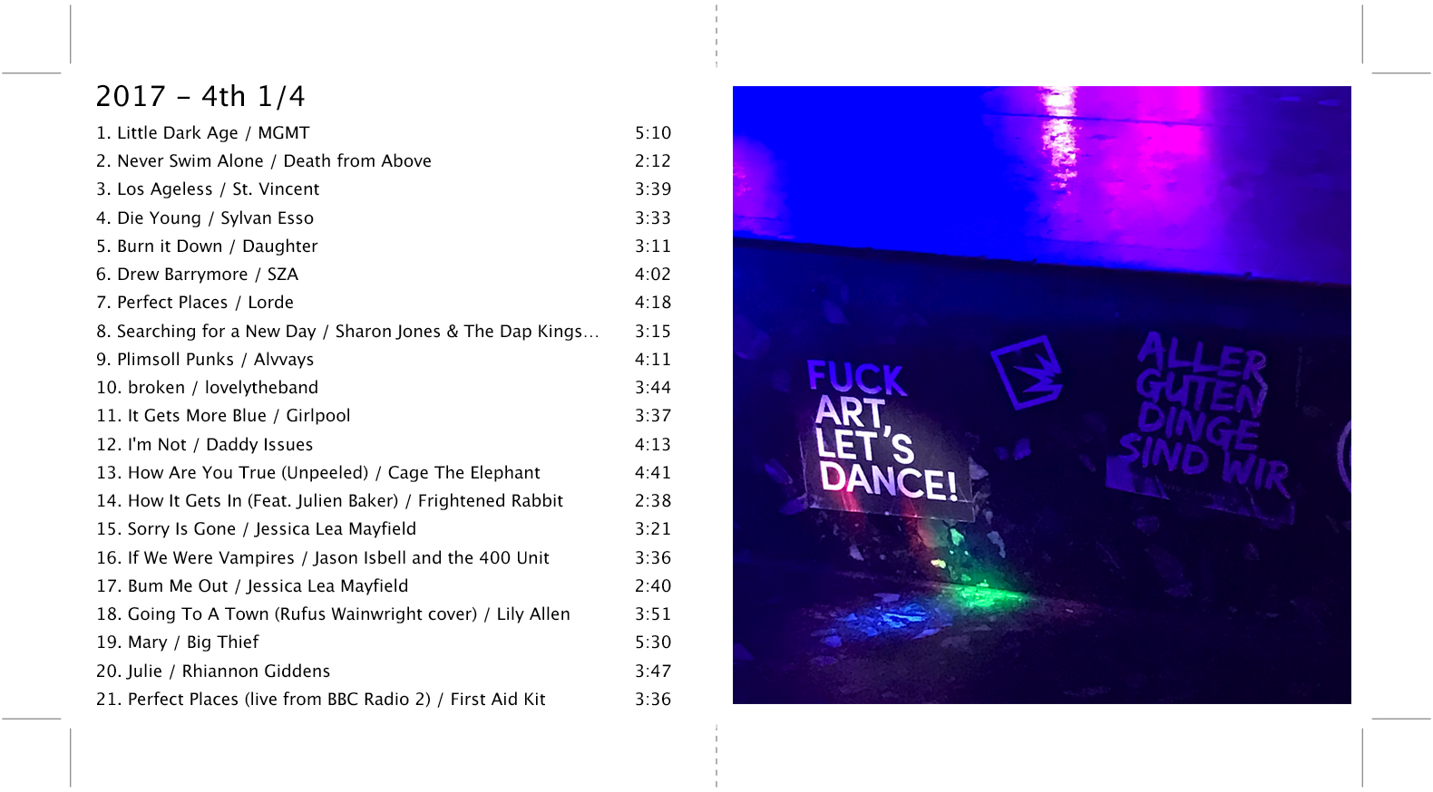 How quickly another year comes to an end. Still got to listen to a few more new songs before the year was over. Here are my favorites songs from the last quarter of 2017.