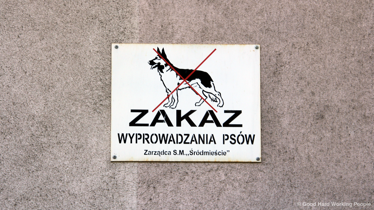 | You may think this sign means that German Shepard Dogs are not allowed in Poland. But “Wyprowadzania Psow” just means “dog” (and “Zakaz” means “ban”) |