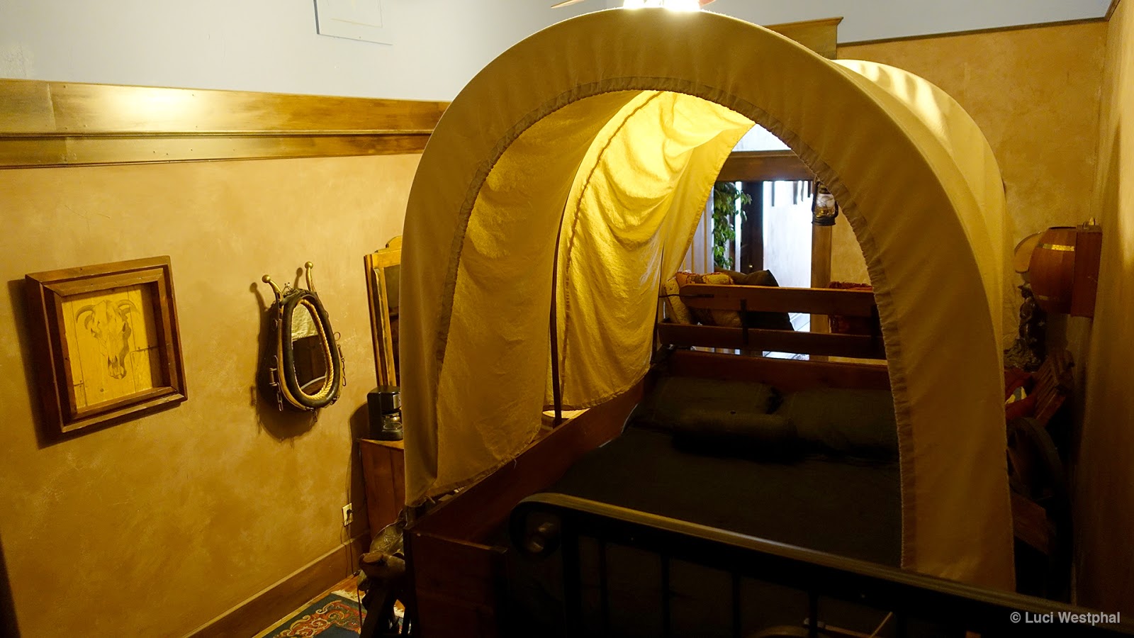 | Covered-wagon bed in the Hollywood Western Suite of The Bisbee Grand Hotel Bisbee, Arizona |
