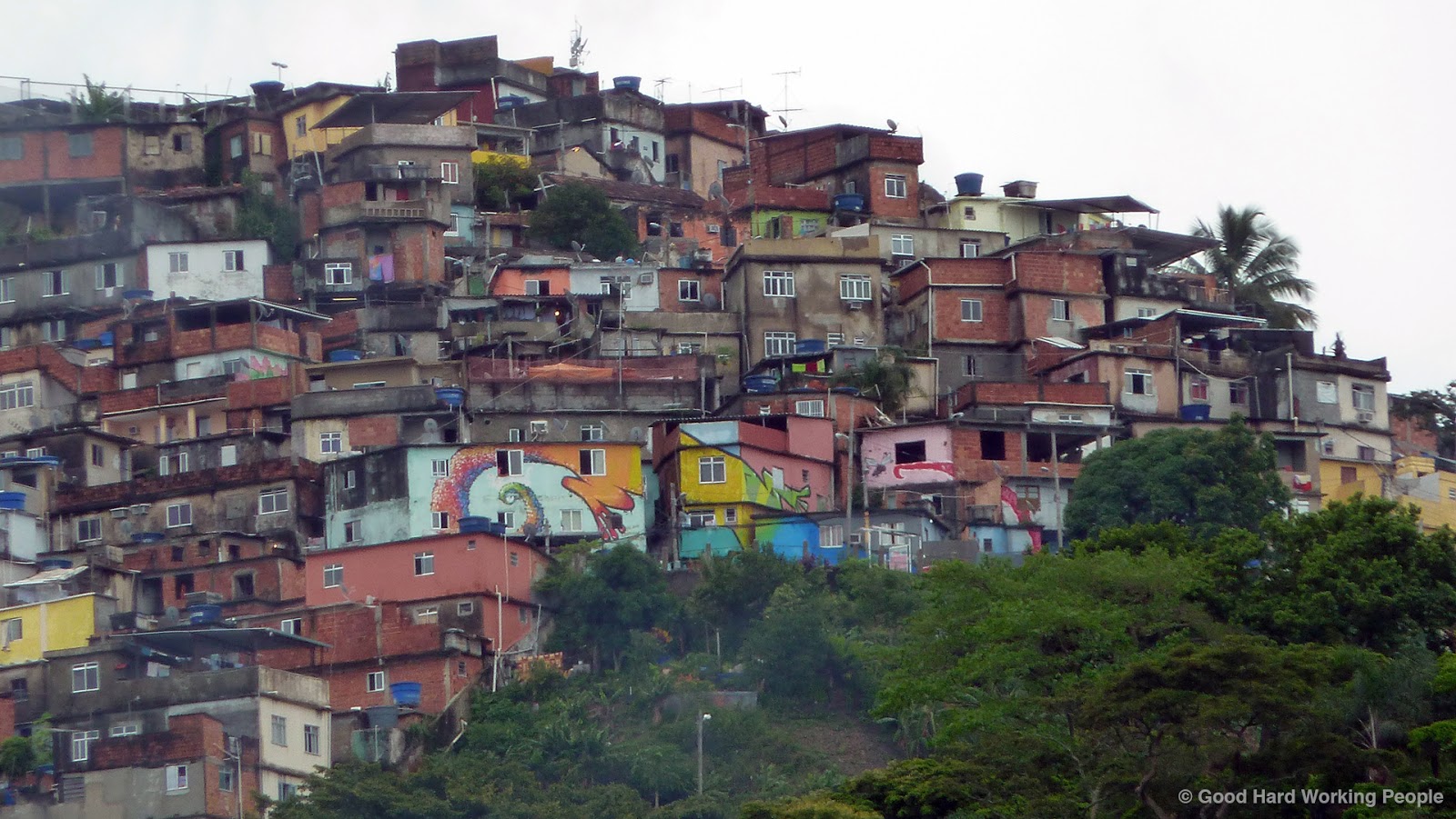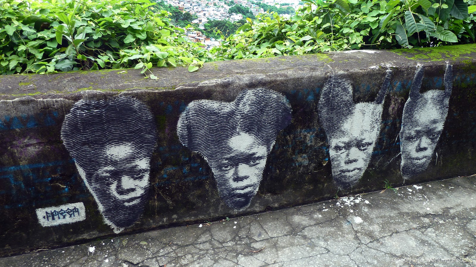 | Street art at entrance of favela in Santa Teresa – with a view of downtown Rio and Sugarloaf Mountain. |