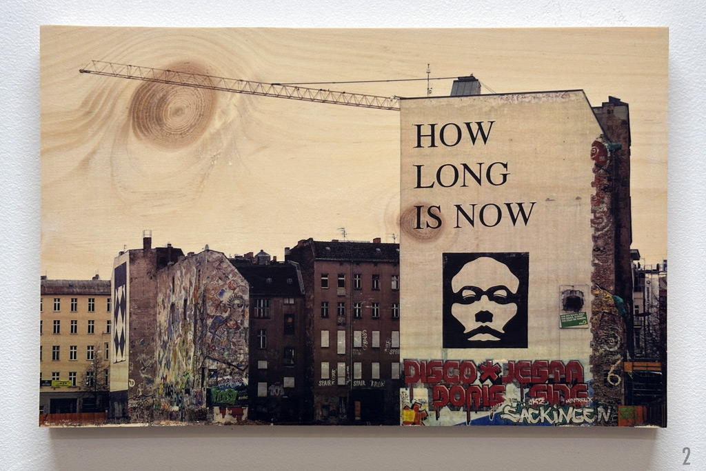 Photo of a street art scene hand-transferred to reclaimed fence wood.