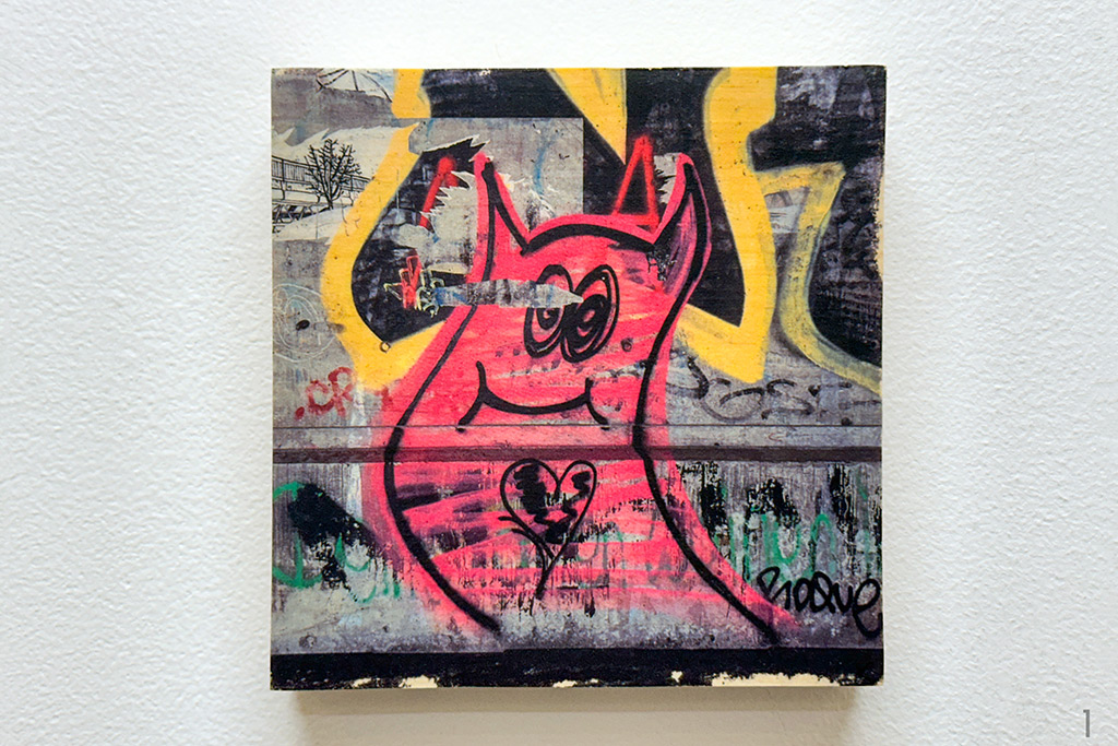 Photo of a street art scene hand-transferred to reclaimed fence wood.