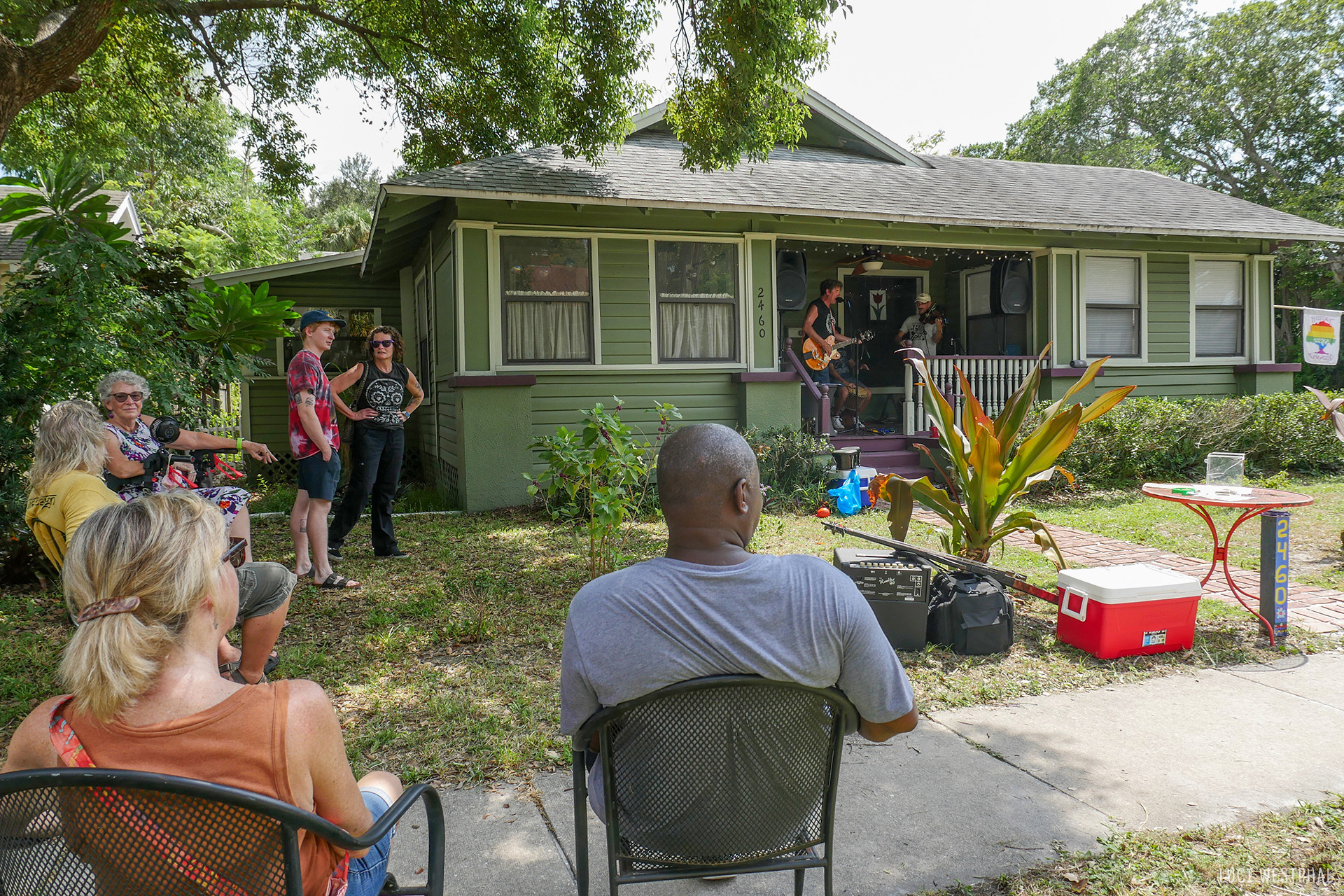 play music on the porch day 2023 historic kenwood, st. pete, people listening to music on bungalow porch