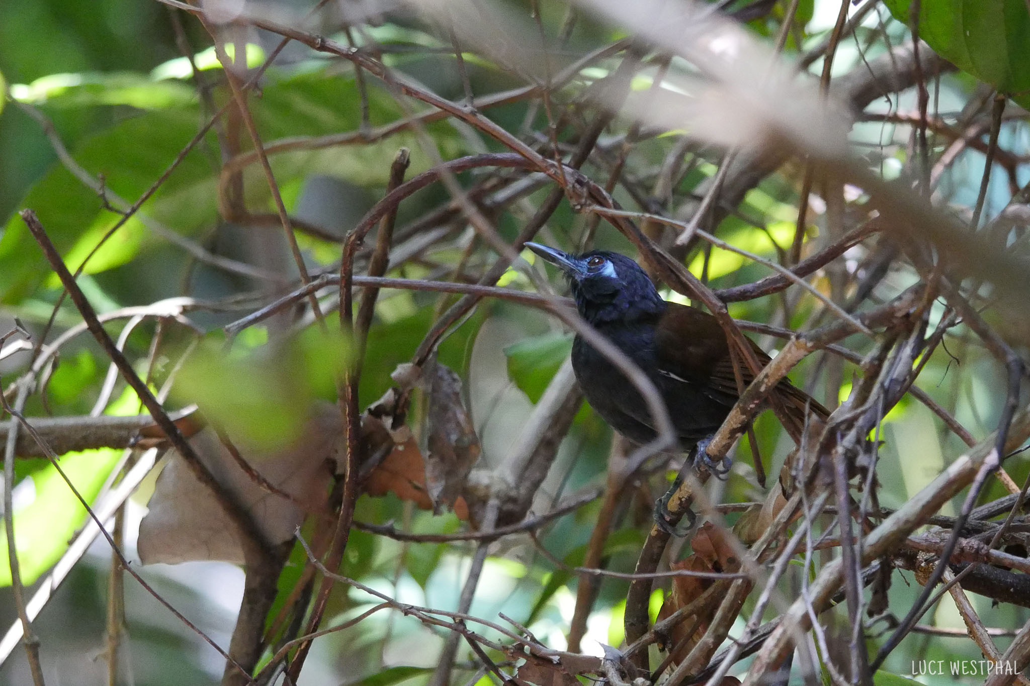 Chestnutbacked antbird, black, brown back, blue face