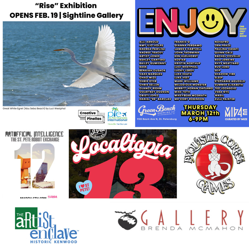 There are so many art exhibits, opening receptions, and other cultural events featuring my artwork coming up in the next few weeks in St. Pete and beyond, the schedule warrants its own blog post. There will be more post coming about the specific events.